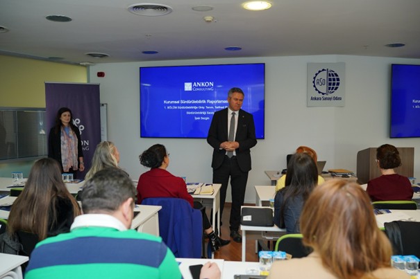 Açılış konuşması ASO Genel Sekreter Yardımcısı Sn. Dr. Ahmet Dinçer tarafından yapılan, ANKON – Ankara Sanayi Odası (ASO) iş birliğiyle 26 Şubat – 14 Mart arasında yürütülecek 60 saatlik bu programda katılımcılar, Lisanslı Kurumsal Sürdürülebilirlik Raporlaması Uzmanlığı yolculuğunda bir adım atıyor ve hem KGK sınavı için hazırlanıyorlar hem de uygulamalı çalışmalarla TSRS uyumlu Kurumsal Sürdürülebilirlik Raporu hazırlamayı öğreniyorlar. Katılımcılar, akredite eğitime katıldıkları için 8 ay sürdürülebilirlik uzmanı mesleki tecrübe şartından muaf sayılacaklar.